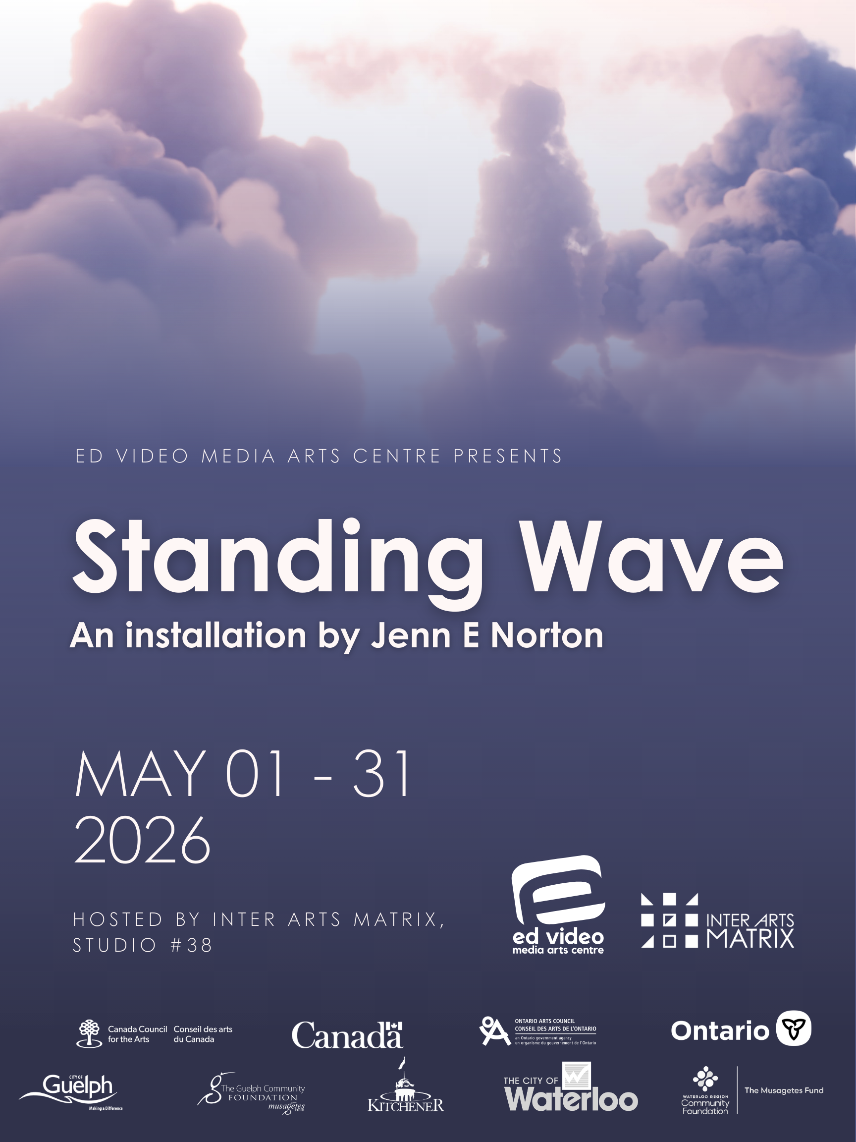 StandingWave is a multichannel installation that draws upon natural phenomena, such as cloud formations, paired with pareidolia and surrealist imagery to explore emotional and mental states of being. The title derives from the phenomenon of clouds forming above mountains, known as standing wave clouds or lenticular clouds, which indicate that rain is imminent. Observers often mistake these clouds for UFOs because of their smooth, saucer-like shapes. A standing wave is a vibrational pattern that occurs when two waves oscillate at the same frequency and amplitude but move in opposite directions, interfering with one another. At certain points, the amplitude is zero; at others, it reaches its maximum. Norton employs this occurrence as a metaphor in a long-form animation in which clouds transform and morph through representations of places, people, animals, and objects, as a rolling thought process of hypnagogic visions.